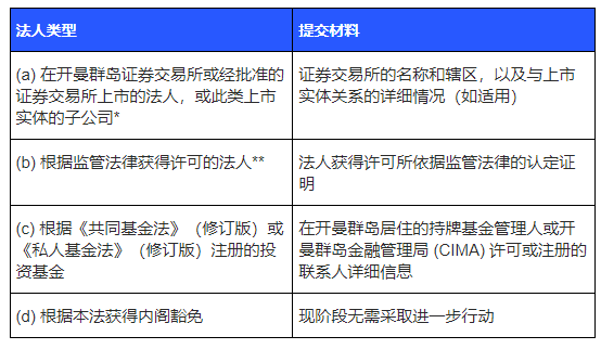 若您位于開(kāi)曼群島的實(shí)體,按照此次修改前的法規(guī)被視為不在約束范圍內(nèi)或享受豁免權(quán)益,則須盡快對(duì)其進(jìn)行評(píng)估,確定該實(shí)體是否符合以下標(biāo)準(zhǔn)之一: