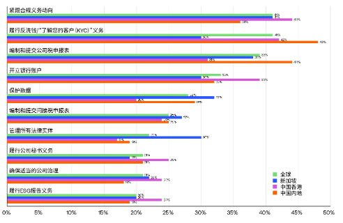 圖表顯示了企業(yè)在其他國家或地區(qū)設(shè)立和管理法律實(shí)體時面臨的重大挑戰(zhàn)(受訪者排名前三位)