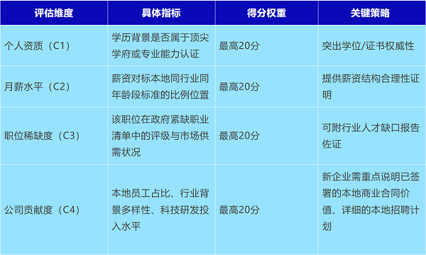所有薪資未達(dá)豁免標(biāo)準(zhǔn)者,必須在COMPASS框架的綜合評(píng)估(滿(mǎn)分100分)中累積至少40分。該模型從四個(gè)維度精準(zhǔn)量化申請(qǐng)人價(jià)值: