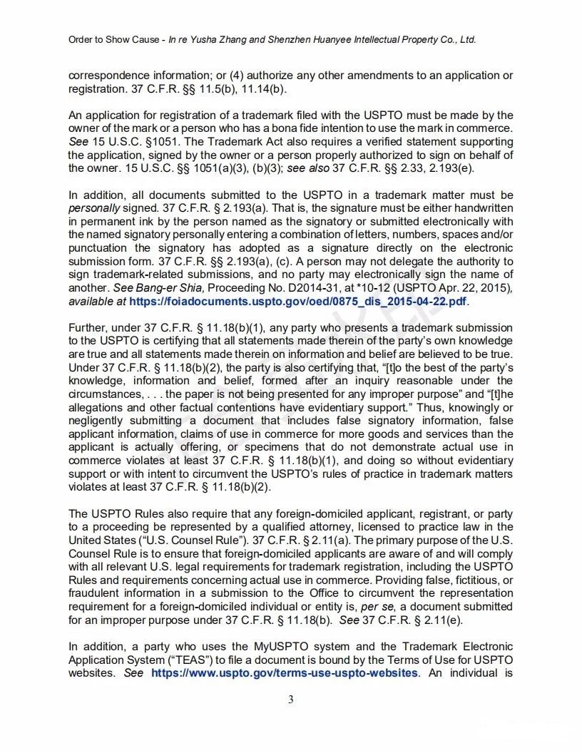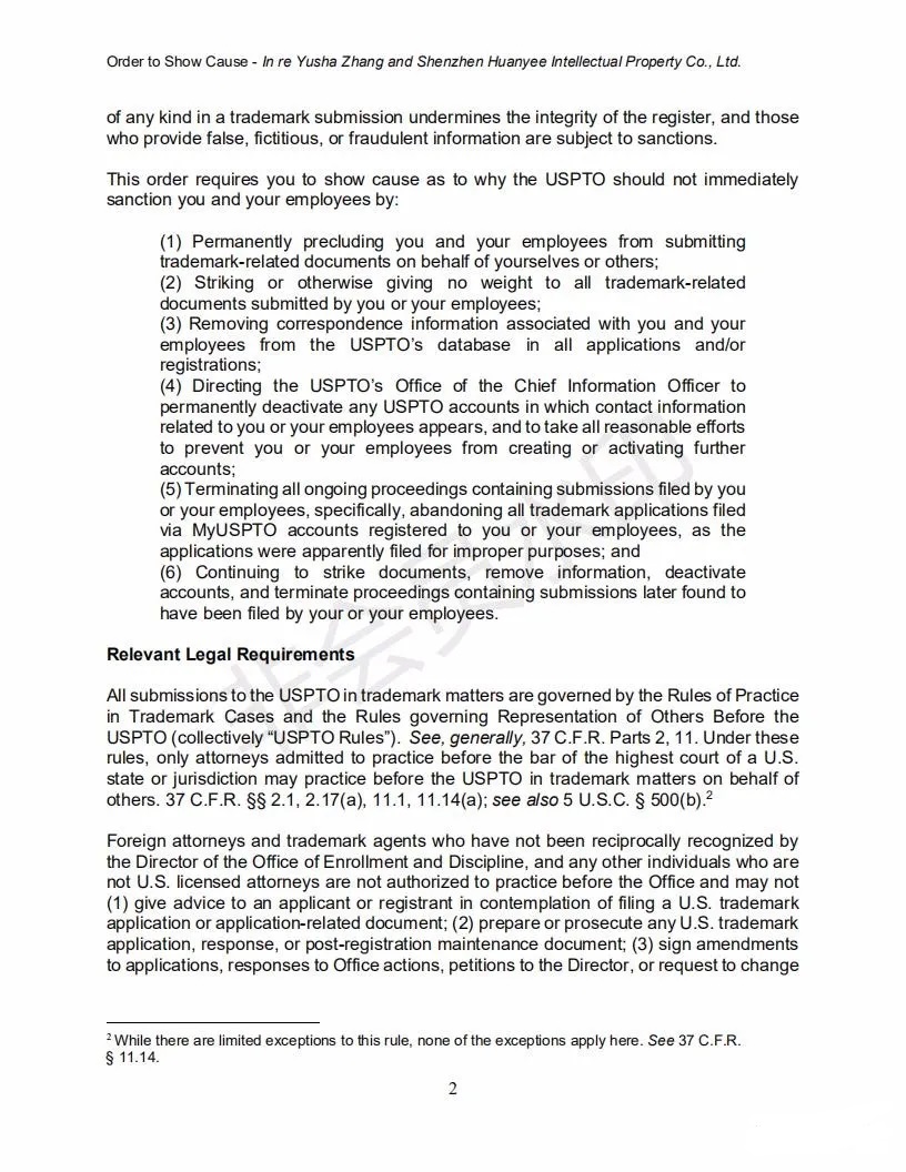 2021年6月8日,美國專利商標局(USPTO)向中國深圳一家知識產權公司的代表人發出一份123頁的“ORDER TO SHOW CAUSE”。對該公司代理提交的批量美國商標的行為,尤其是其中涉及到第三方簽名提供虛假、虛構和欺詐信息的行為提出質疑,要求該公司提出合理的理由,并在美國東部時間6月22日下午5:00前進行回復。否則USPTO將會對該代理機構以及代表人進行制裁。