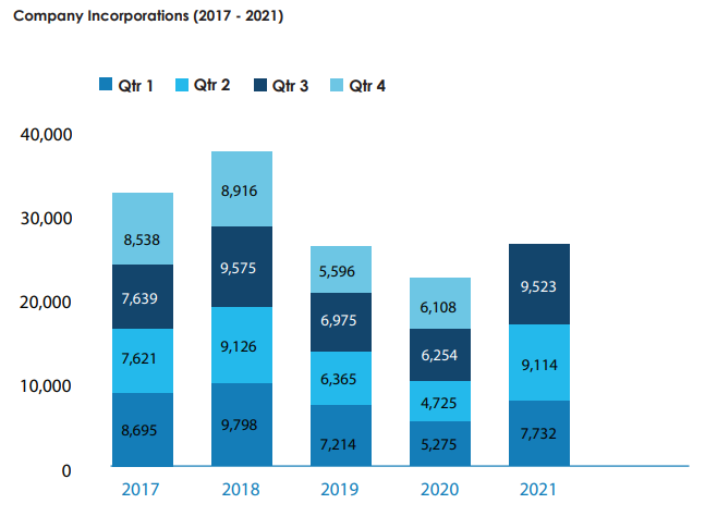 在全球稅務規(guī)范的要求下,離岸公司BVI經歷著CRS和經濟實質的雙重打壓,在此情況下,不少人認為BVI公司差不多要涼涼了。但是,根據近期BVI金融服務委員公布的2021年第三季度簡報數據,BVI公司前三季度新增公司注冊數量明顯上升。